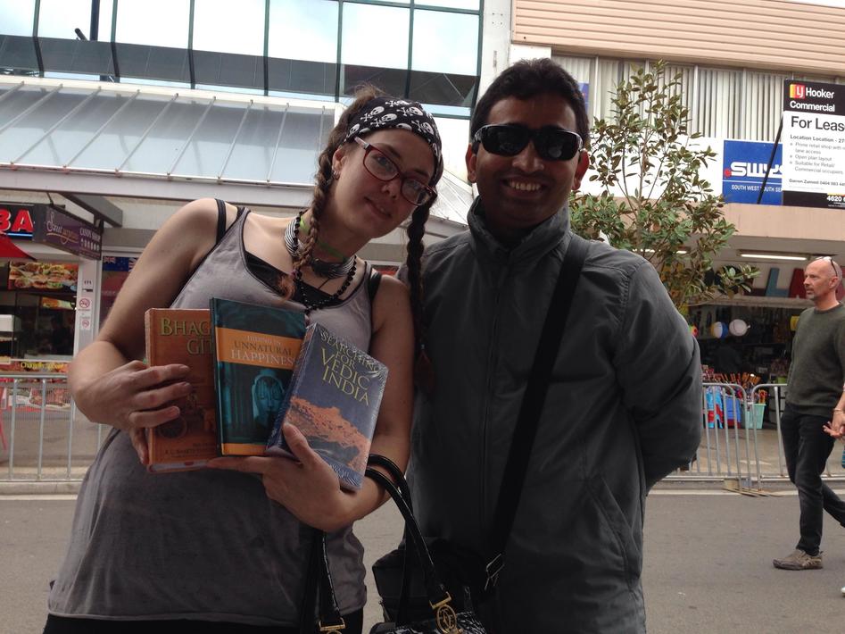 10 mins after Gerrainne, another geologist came running, gasping for air, and she said, “My friend Tony sent me to you, to get the Srimad Bhagavatam set. I am glad I caught you, just before you packed up. She also took a Gita, SVI, and HIUH and requested that I deliver a Bhagavatam set.