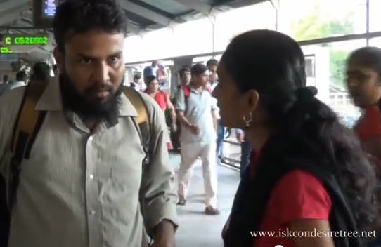 Young girls distributing Vedic literature on railway bridge in Mumbai