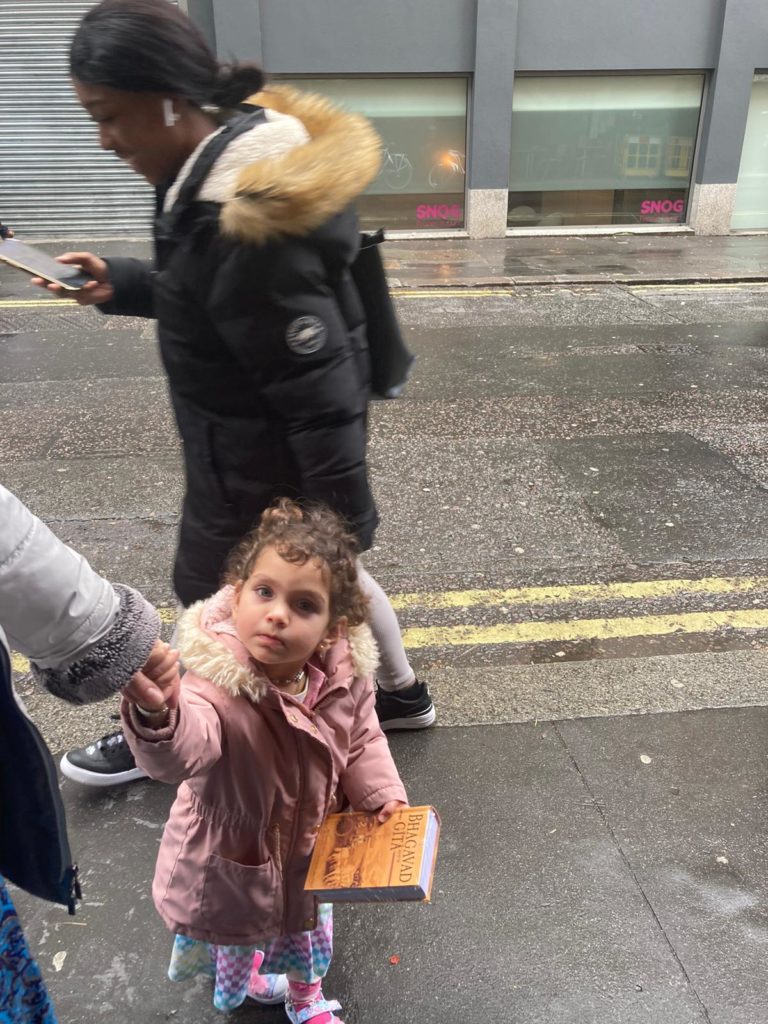 Lately, she started walking and was on the streets of London with books, holding her mama’s hand. It is a cuteness overload to see a sankirtana devotee in diapers distributing Lord Chaitanya’s mercy.