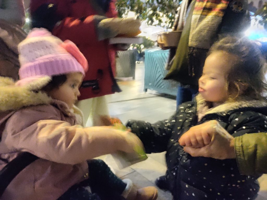 Less than two years old, Sangita started distributing books when she was barely a year old, imitating the elders while on her pram during sankirtana. During the past Christmas marathon she sold a book to a Chinese kid, and the kid’s mom gladly gave a donation.